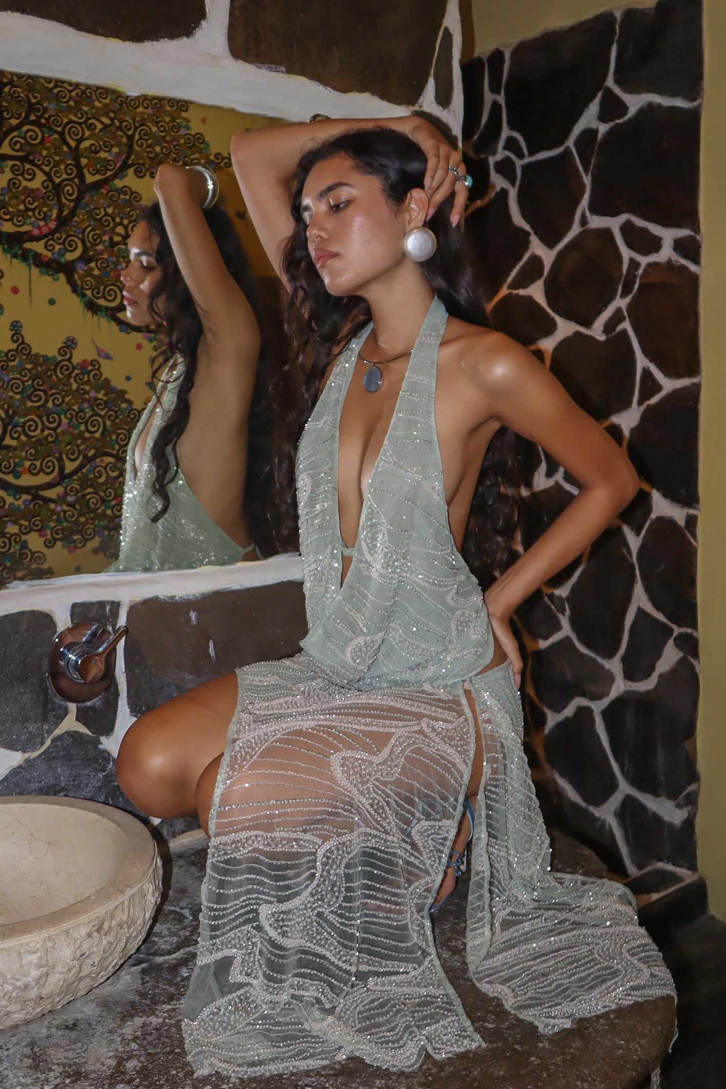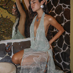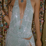 Crafted from an iridescent fabric, the Aquamarine Top reflects a sense of freedom and sensuality, draping gently across the body and glimmering with each movement. Its open tie-back design adds an element of sexiness, allowing the top to flow freely while enhancing the wearer’s silhouette.